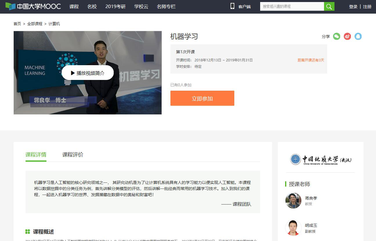 2018年12月13日,FIFA官网中文版入口《机器学习》课程在中国大学MOOC平台正式开课。本课程由2026世界杯官网教授蒋良孝,2026世界杯官网副教授胡成玉主讲,课程内容精心设计,为学生提供了便利的学习平台。本课程将以数据挖掘中的分类任务为例,首先讲解分类模型的评估,进而讲解一批经典而常用的机器学习技术,是高等学校机器学习领域科研人员和对机器学习兴趣浓厚的师生不可或缺的高质量课程。课程链接: