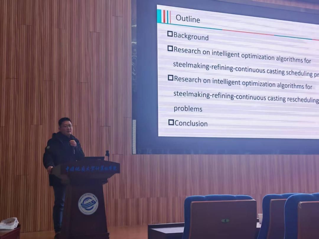 武汉科技大学彭琨琨特任教授以《炼钢-精炼-连铸智能调度方法》为题作报告。他先以钢铁生产流程为背景,引出静态与动态两类调度难题:针对静态情形,提出改进人工蜂群算法与融入能耗指标的离散文化基因算法,实验对比验证其优势;面对动态扰动,构建含六种优化目标的再调度模型,设计 ETVND 与改进蜂群两法协同求解。最后总结指出,智能优化算法在钢铁流程节能减排与提质增效中仍大有可为。