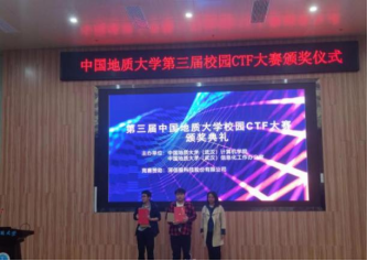 傅苑为老生组一等奖获得者陈凯明,新生组一等奖获得者汪润东颁奖。程池和黄诗勇为老生组二等奖得主付兀哲、黄翠,新生组二等奖得主孙升阳、张桐颁奖。高浪和朱静为老生组三等奖选手马睿、周意芯、赵起萌、张福茂、耿春秋,新生组三等奖选手伍梦扬、高会胜、邰霄、朱轩宇颁奖。获得本次CTF大赛优秀奖的选手是肖炎徐、李沐卿、霍奥林、胥瑞、李国立、高晔豪、乔晓晓、高尚、王岸冲、夏莹莹。