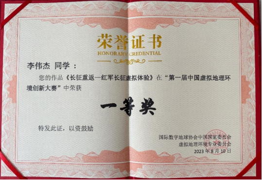 本次竞赛从2023年2月开始到作品提交结束,整个过程历时五个月。李伟杰等五名同学在邱芹军、刘郑和陶留锋三名老师的指导下,查阅了虚拟地理环境的文献资料,师生讨论确实赛道与选题并定期组织会议完成进度,对作品进行反复修改与完善,认真撰写项目实施方案,最终提交了出色的作品,通过专家初审评阅和现场汇报等环节的严格筛选,他们最终脱颖而出,荣获一等奖。他们的杰出表现展现了世界杯官网学子的才华,彰显了世界杯官网学子在学术和团队合作方面的卓越素养。