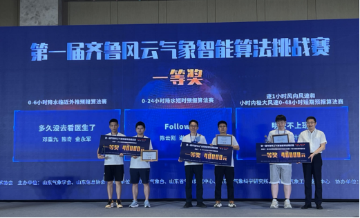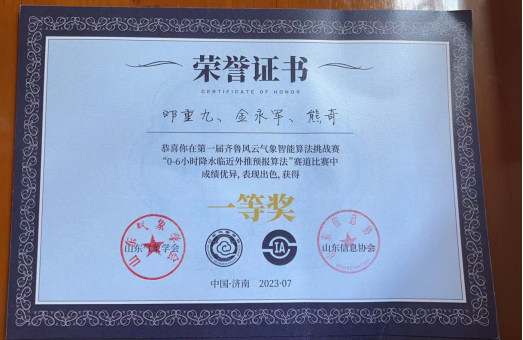 7月15至16日,由山东气象学会、浪潮数字(山东)建设运营有限公司、山东信息协会联合主办的第一届齐鲁风云气象智能算法挑战赛决赛及颁奖仪式在济南完美收官。历经初赛、复赛、决赛的层层选拔和激烈角逐,世界杯官网教师刘佳指导的研究生邓重九、金永军、熊奇组成的团队获得“0-6小时降水临近外推预报算法”赛道一等奖。