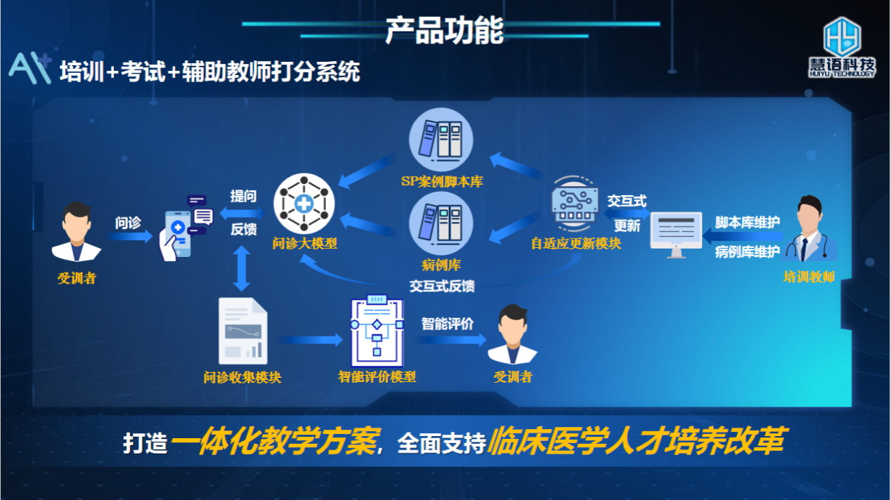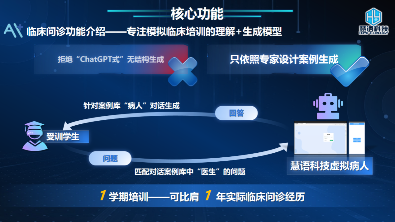 该项目把计算机专业知识与医学问诊相结合,主要目的是提升医生问诊能力。医生问诊能力是一个医生必备的专业技能。培养医学生的问诊技能,需要有病人或模拟病人的配合,一直以来效率低下。针对上述痛点,该项目推出了一个医学生问诊培训的学习软件,根据具体的医学科别,模拟病人,回复医学生的各种问题,完成整个问诊的过程,最后根据医学生在问诊交流中的表现给出得分。该项目背后的医学支撑和技术支撑扎实,具有充分的市场空间和市场需求,盈利潜力巨大,具有重大社会意义和产业前景。