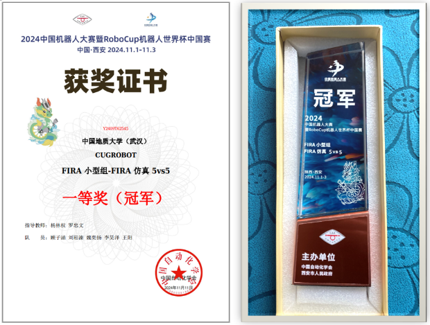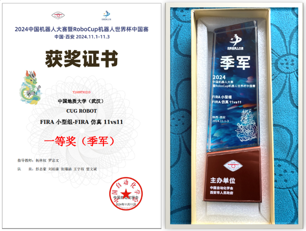 我校派出了由杨林权副教授和罗忠文教授指导,刘崧溱、顾子涵、张瑾涵、彭志豪、望文斌、魏奕扬、李昊泽、王宇程、王阳等学同学组成的两支CUGROBOT代表队。经过三天的激烈角逐后,在FIRA小型组仿真赛项的5vs5和11vs11比赛中,我校代表队一路奋战,表现出色,勇夺一个冠军和一个季军在内的两项国家级一等奖。
