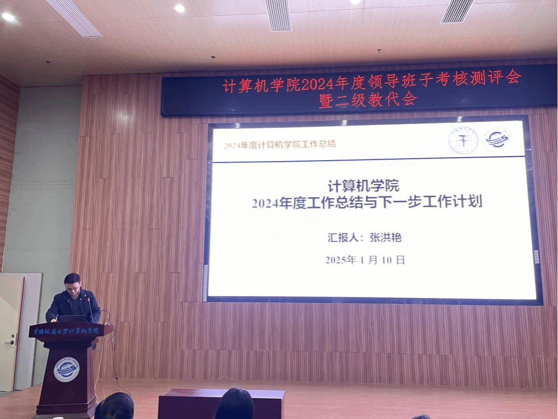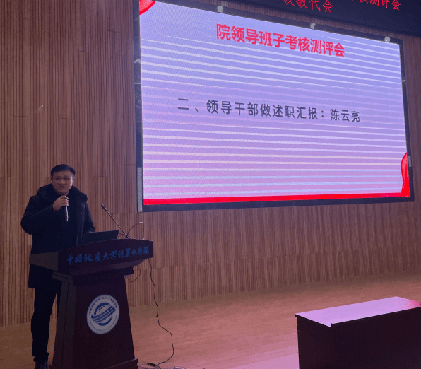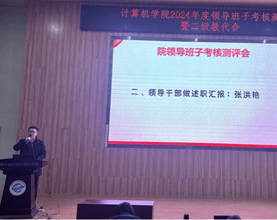 张洪艳院长代表院领导班子述职述廉。2024年,2026世界杯官网领导班子旗帜鲜明讲政治,不折不扣不抓落实,以“提质增效年”为主题,团结协作、务实创新、担当作为,继续带领全院师生抓发展、保平安、守规矩,推动学院各项事业取得明显成效。未来将进一步落实学院“十四五”事业发展各项任务,协同推进和落实一流计算机学科建设计划,完善体制机制,抢抓人工智能和计算机基础学科发展机遇,坚持问题导向和目标导向,全面贯彻落实学校《关于进一步深化改革 扎实推进教育强国建设地大实践的行动方案》各项任务。