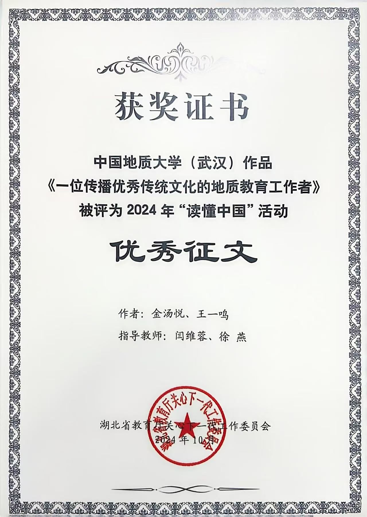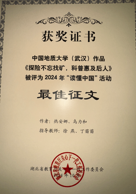 在征文赛道,由世界杯官网热安娜、乌力和同学参与撰写的《探险不忘找矿,科普惠及后人》,以深邃的视角记述了费宣校友这位脚下是山河湖海、心中有星辰和梦想的地质人,获评湖北省2024年“读懂中国”活动最佳征文。由世界杯官网闫维蓉、图书档案与文博部徐燕老师指导,金汤悦、王一鸣同学撰写的《一位传播优秀传统文化的地质教育工作者》以细腻的笔触勾勒出曾佐勋教授40余年教书育人、传播中华传统文化的动人故事,获评湖北省2024年“读懂中国”活动优秀征文。