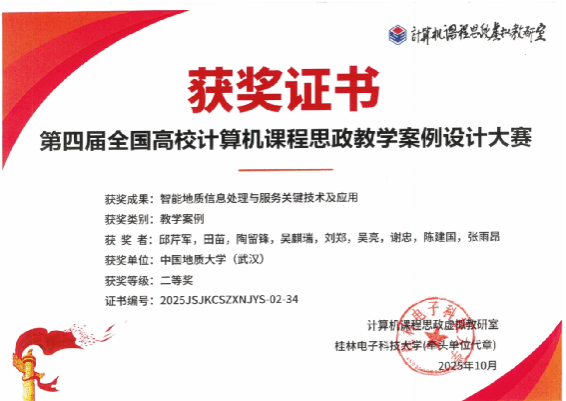 在学院党政指导与支持下,陈麒玉、刘刚、陈大颉、方洪峰完成的《基于生成式AI的复杂地质结构智能表征》和彭雷、戴光明、王茂才、宋志明、陈晓宇、武云完成的《面向深空探测轨道设计的差分演化算法》荣获一等奖,其中前者还同时获得全国高校可信人工智能教学案例设计大赛一等奖。邱芹军、田苗、陶留锋、吴麒瑞、刘郑、吴亮、谢忠、陈建国、张雨昂完成的《智能地质信息处理与服务关键技术及应用》荣获二等奖。