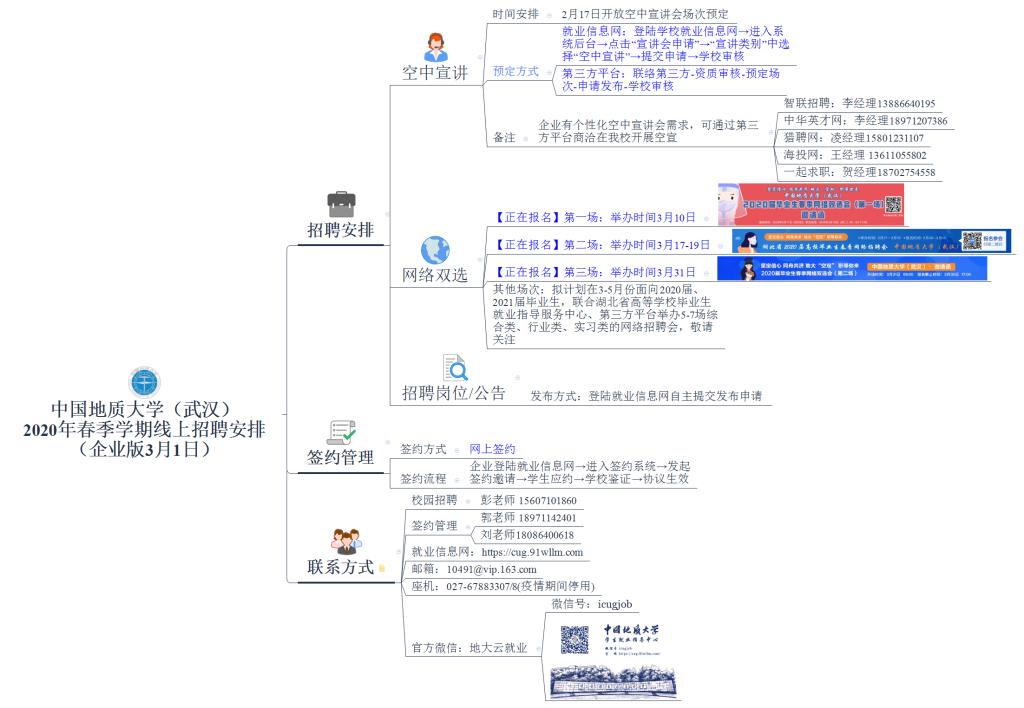 春季学期,学校积极与智联招聘、中华英才网、猎聘网、海投网、湖北省人才市场等第三方专业机构联合举办网络双选会,现将本学期网络双选会安排如下: