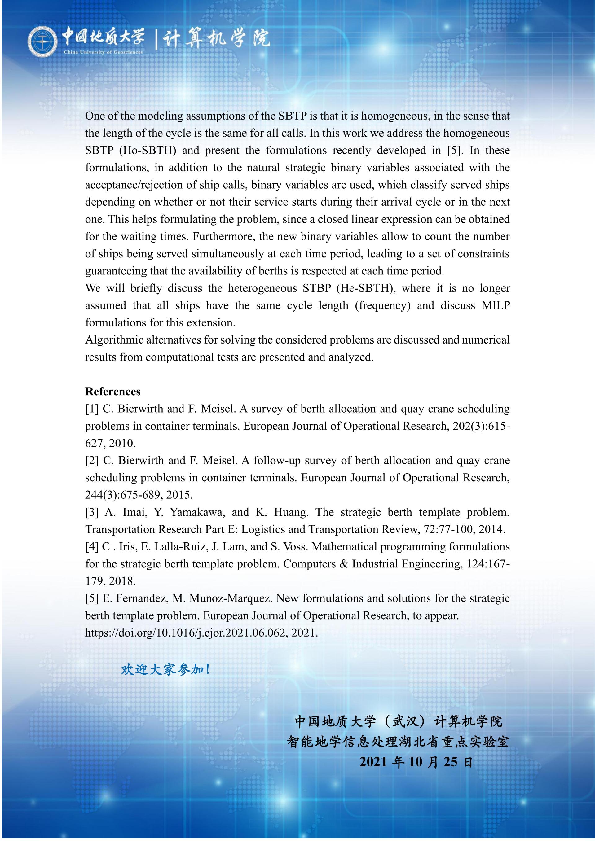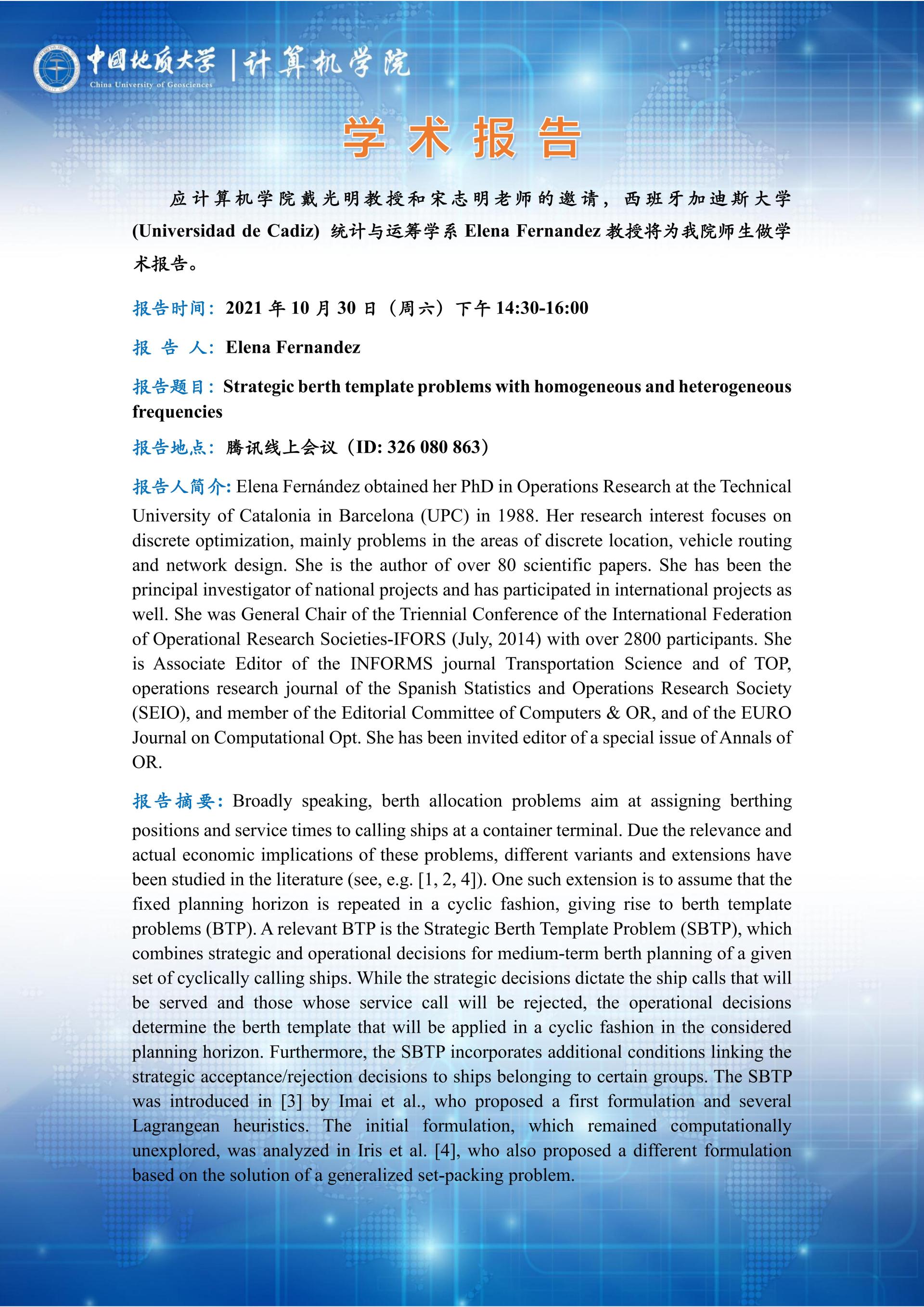 学术报告——西班牙加迪斯大学Elena Fernandez:Strategic berth template problems with homogeneous and heterogeneous frequencies