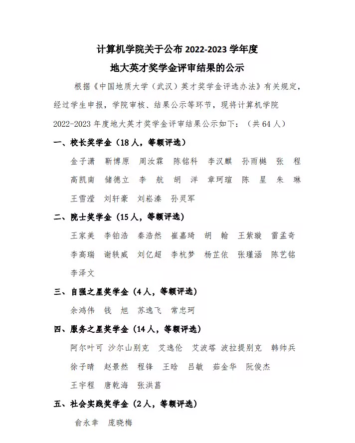 2026世界杯官网关于公布2022-2023学年度地大英才奖学金评审结果的公示