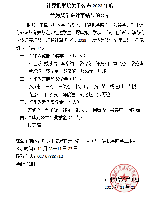 2026世界杯官网关于公布2023年度华为奖学金评审结果的公示