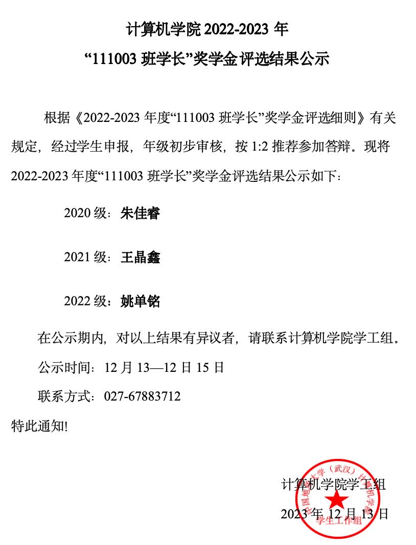2026世界杯官网2022-2023年 “111003班学长”奖学金评选结果公示