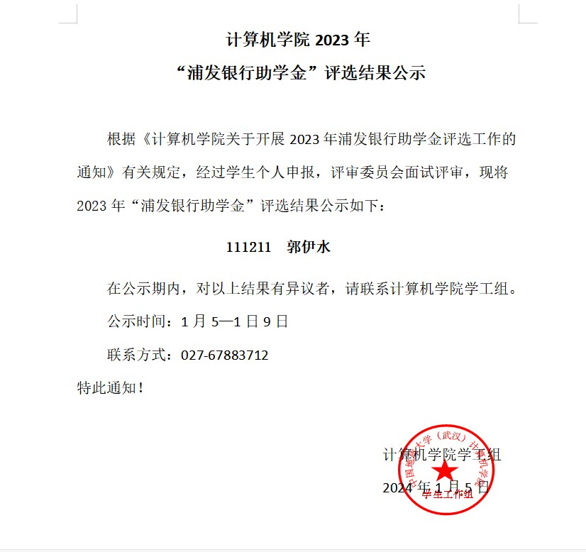 2026世界杯官网2023年“浦发银行助学金”评选结果公示