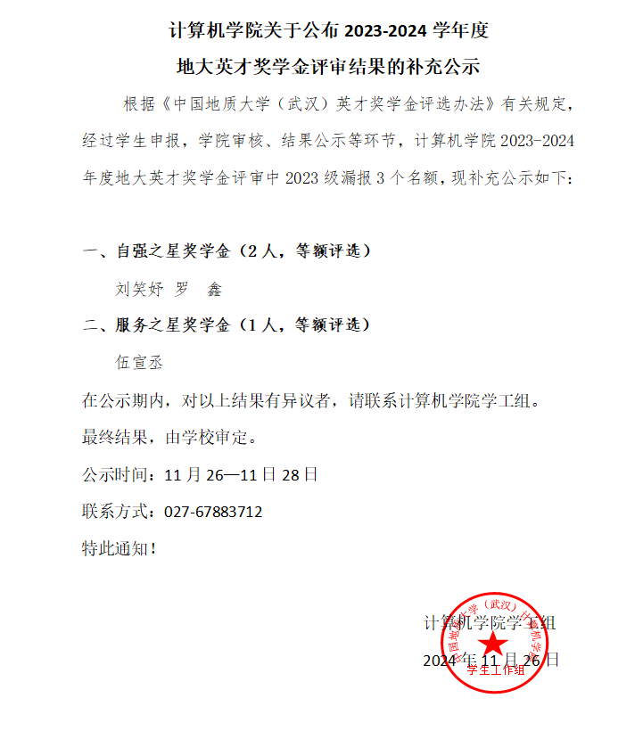 2026世界杯官网关于公布 2023-2024 学年度地大英才奖学金评审结果的补充公示