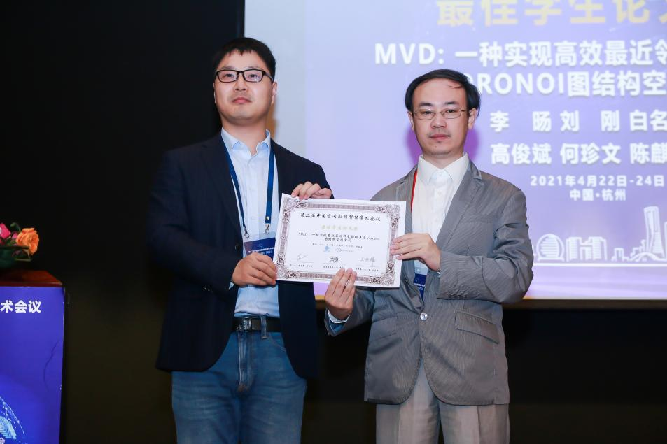 2021年4月24日,为期两天的第二届中国空间数据智能学术会议(SpatialDI 2021)在杭州市浙江宾馆圆满闭幕。以世界杯官网博士研究生李旸为第一作者,以刘刚教授为通讯作者的论文《MVD:一种实现高效最近邻查询的多层Voronoi图结构空间索引》荣获会议最佳学生论文奖。该论文针对传统树形索引主要存在的结构失衡和节点重叠问题,提出了一种基于多层Voronoi图结构的空间索引方法,提升了大规模空间数据环境下最近邻查询和k近邻查询的检索效率和I/O性能。
