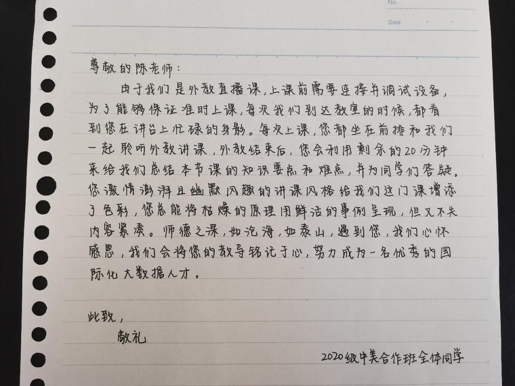 (通讯员:张园园)在中美两方教师的共同努力之下,中美合作班的学生已经顺利完成了2020-2021学年的课程,其中19G201班第一学期班级平均学分绩点位列年级第一。天涯海角有尽处,只有师恩无穷期。同学们明白自己的优异成绩离不开老师们的谆谆教诲,对本学年教授专业课程的老师们表示由衷的感谢。