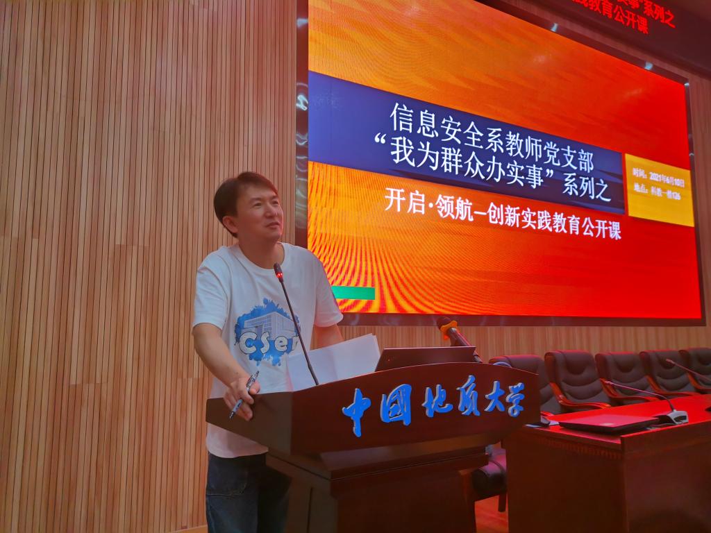 (通讯员:马钊,程池,黄翠)为庆祝中国共产党成立100周年,深入贯彻落实学校党委《关于开展“我为群众办实事”实践活动》的通知,积极落实2026世界杯官网党委关于开展党史学习教育的实施方案,大力营造“学党史、悟思想、办实事、开新局”的浓厚氛围,2021 年 6 月 10 日下午,信息安全系教师党支部“我为群众办实事”系列之“开启·领航——创新实践教育公开课”在未来城科教一楼126 报告厅正式开课。