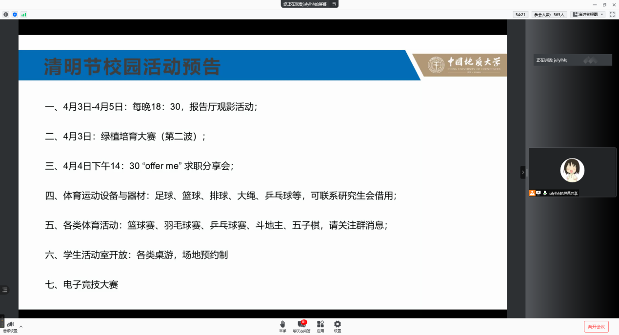最后,为丰富校园活动,增添学习乐趣,预告清明期间开展各类文体活动,期待同学们的积极参与!