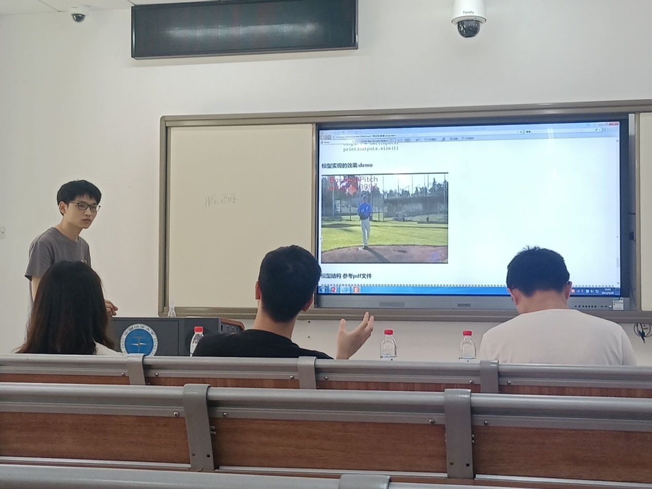 各答辩队伍基于实验理论基础和数据分析,展现立项以来的研究成果。陈俊的《人体动作在线识别与计数》项目以C3D模型为例,介绍对UCF101数据集进行人体动作识别的方法,演示模型效果的同时分析当前存在的问题,并提出下一步科研计划。李天屹团队的《基于深度学习的遥感影像语义分割》项目将深度学习中的OCR方法运用于遥感影像语义分割中,通过对OCRNet进行修改完善,加入了GBR模块、三并行注意力模块,设计出Tri-parallel OCRNet模型,使其能够在遥感影像语义分割中发挥出作用。李铂浩团队的《基于PPG信号的运动手环高效认证机制设计》项目,详细介绍PPG信号与PPG认证技术,现场展示团队所做的数据预处理、数据分析、信号特征提取及PPG认证技术实现等。
