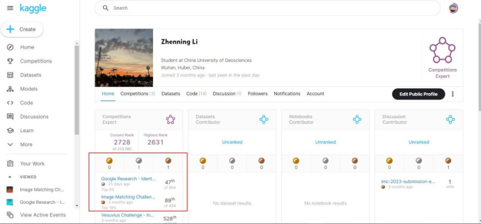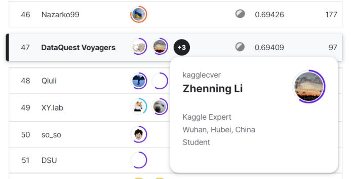 在此次的五场竞赛中,世界杯官网数据科学与大数据技术系2020级中美本科教育合作办学项目本科生李祯宁同学以及谭以宁、秦浩然、陈予贤三人组成的队伍SatoshiShimomoto发挥出色,获得佳绩。Kaggle创办于2010年,目前已经被Google收购,拥有超过80万名数据科学家用户,是全球顶级的数据科学竞赛平台,在数据科学领域享有盛名。Kaggle的使命是通过众包的方式,解决世界上最棘手的问题,同时推动机器学习和数据科学的发展。对参赛者来说,不仅是考验自己能力,更是一场实战经验。