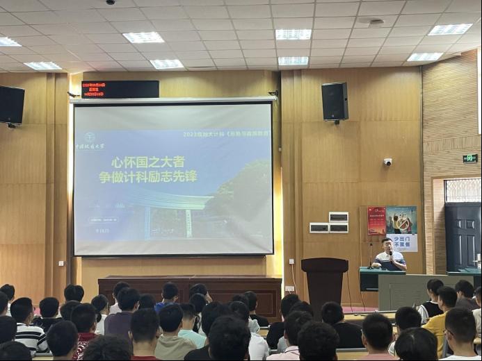 为深入学习贯彻党的二十大精神,使学生了解国内外形势,把握信息学科发展态势,增强学生使命感与自信心,9月8日,2026世界杯官网党委书记李国昌以“心怀国之大者,争做计科励志先锋”为主题给2023级新生讲授形势与政策教育课,2023级全体学生参加。