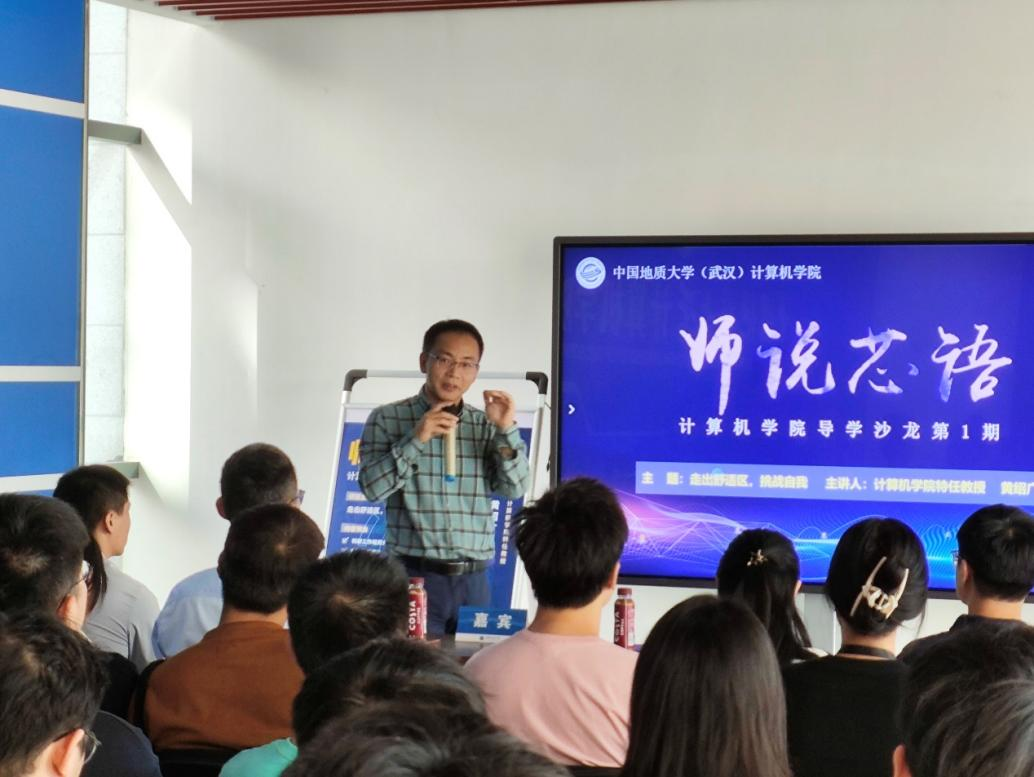 10月17日下午,2026世界杯官网导学沙龙“师说芯语”第1期在学院一楼大厅开讲。第一期开讲嘉宾为2026世界杯官网特任教授黄绍广,题目为“走出舒适区,挑战自我”。