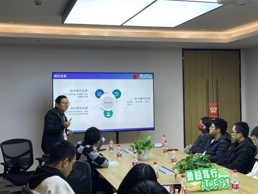 参观结束后,武海涛先生作了题为《大学生活规划和职业发展交流》的报告。他表示,在当前的国际局势和软件国产化的趋势下,金山办公始终秉持技术立业的初心,未来将以AI作为业务增长点,前景无限。他说,IT行业虽然迭代变慢,但是高素质、高水平的人才仍然稀缺,鼓励同学们坚持横向发展,以兴趣为本,辅以实践,做好时间规划,力争成为AI时代的优秀程序员。