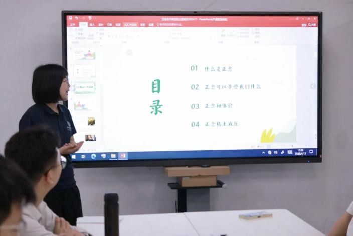倾听完大家的分享后,闫老师进一步引入本次活动的核心主题——正念。她用通俗易懂的语言为大家介绍了正念的概念:正念是一种全然关注当下的状态,是不带评判地觉察此时此刻正在发生的事,无论是外在环境,还是内心情绪。正念并非要我们“什么都不想”,而是通过呼吸、感官和觉察,建立起与内心的联结,提升对情绪的理解力与掌控力。