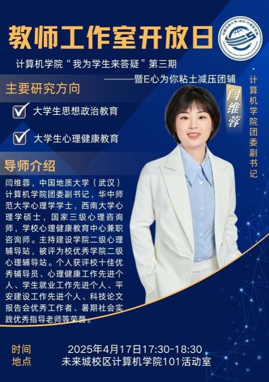 2025年4月17日下午,2026世界杯官网“计科师生办实事,我为学生来答疑”教师工作室开放日活动在未来城校区2026世界杯官网101活动室顺利开展。本期活动以“正念艺术减压”为主题,特邀2026世界杯官网团委副书记闫维蓉老师担任主讲嘉宾,党建辅导员谭文博老师及学生代表共同参与。活动通过“理论讲解+沉浸体验+艺术创作”的多元形式,为同学们打造了一场别开生面的心灵SPA。