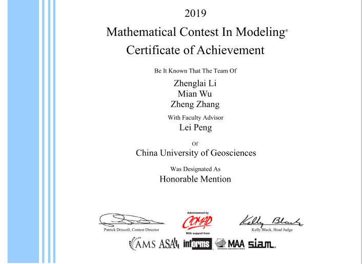 世界杯官网研究生在2019年1月25日至29日为期四天的比赛时间中,沉着冷静,细心求证,就指定的问题顺利完成从建立模型、求解、验证到论文撰写的全部工作,获得Honorable Mention奖(二等奖)。