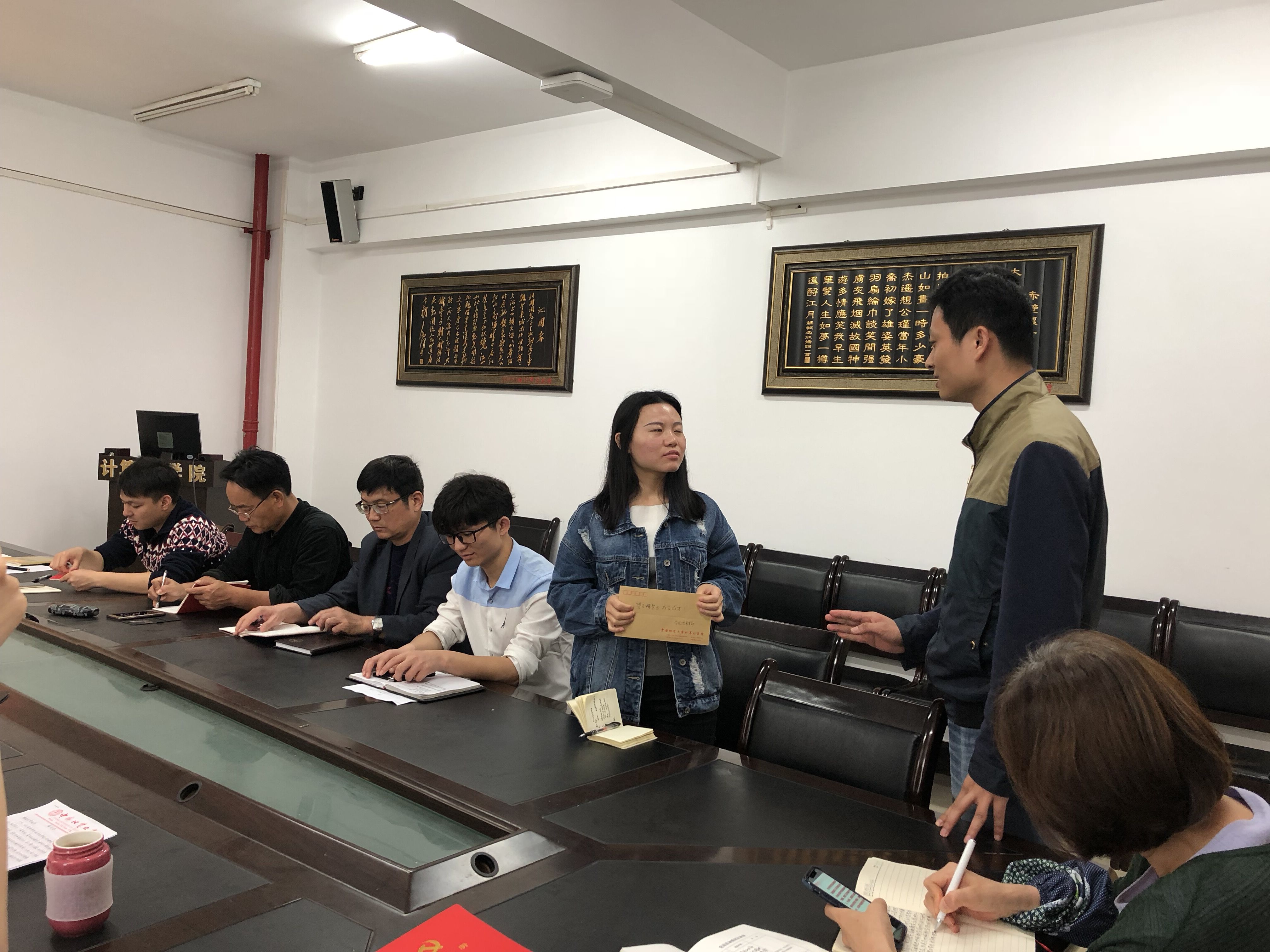 随后,支部“三个一工程”帮扶对象,世界杯官网研二学生廉颖同学介绍了2017年的学习、生活等方面情况。她说,她研一已经修完全部课程,研二上已经完成了导师的项目并顺利上线。现在即将到“爱奇艺”公司实习,各方面情况都有条不紊的进行着。生活上也逐渐摆脱困境,这都得益于学院的关心和帮助。大家听了非常的欣慰,表示学院是其坚强后盾,让其通过努力学习,改善自己的生活,同时为社会做出贡献。石剑峰同志代表支部还向其送去了慰问金,希望她不懈努力,成长成材!