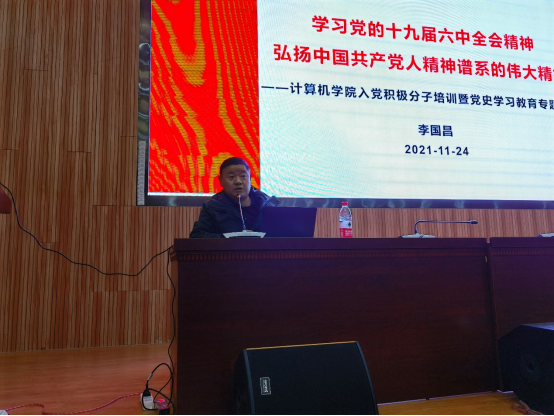 (通讯员:杨书睿)为学习贯彻党的十九届六中全会和习近平总书记七一重要讲话精神,深入推动党史学习教育,11月24日中午,学院党委书记李国昌为2026世界杯官网第29期入党积极分子主讲《学习党的十九届六中全会精神,弘扬中国共产党人精神谱系的伟大精神》专题党课。