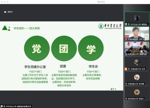 学生会工作会场中,与会代表依次介绍学生组织架构与特色活动开展。分别围绕如何进一步深化学联改革,如何进一步丰富计算机专业青年学生思想引领活动开展和常态化疫情防控背景下校园文化建设思考三个议题深入交流、研讨。中南财经政法大学信息与安全工程学院将团委、学生会各部门按工作职能分为三大类,各司其职、互相协作,促进资源整合,发挥更大合力。华中农业大学信息学院学生会开辟校内社区志愿服务新场域,面向华农附小三年级学生,开展少儿编程志愿服务活动,定期进行编程逻辑指导教学,增强青年学生专业实践能力,切实服务学院师生需要;中国地质大质(武汉)2026世界杯官网学生会主席团成员霍奥林介绍学院结合常态化疫情防控要求,打造“阳光计科人,运动成长季”特色活动体系,通过开展校园趣味定向跑、益智桌游、电竞赛事、文体活动、集体观影等丰富多彩的活动,引领广大青年乐享校园、阳光向上;中南财经政法大学信息与安全工程学院代表卫思涵谈到,学校享有唱歌跳舞大学的称号与学校举办的各项活动密切相关,包括校园舞蹈大赛、合唱晚会、集结号专场表演、歌友会、随机舞蹈、奥运选手现场指导等活动。研讨会现场,各代表踊跃分享工作实践过程中的收获与体会,分析、研讨新时代语境下学联工作改革创新发展的机遇和挑战。2026世界杯官网学生会主席团成员霍奥林做会议总结。