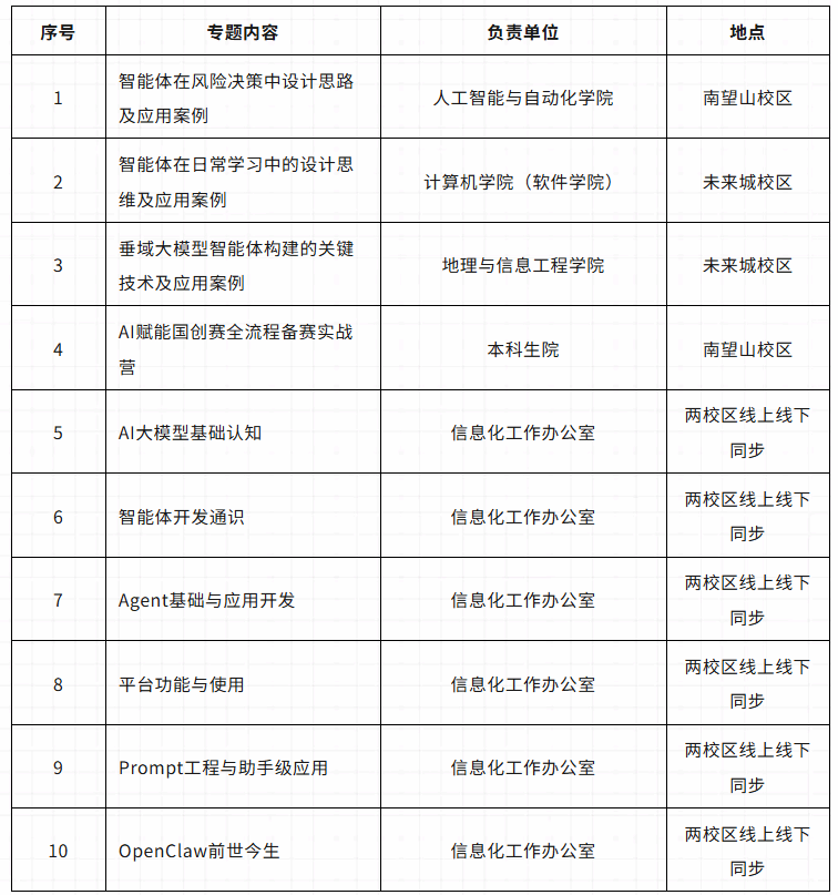 2.人工智能应用工作坊:聚焦实用人工智能工具与智能体开发全流程,开展实操培训。培训涵盖日常办公、内容创作、数据处理等高频场景常用工具的应用操作,以及覆盖从基础架构搭建、核心功能模块配置到调试优化、场景化落地的全链路智能体开发操作。参与人工智能应用创新大赛的选手须完成智能体开发相关必修模块。具体安排见附件2。