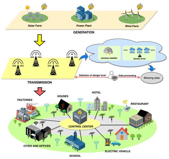 变电站通常位于偏远地区,变电站之间往往距离较远,输电沿线地理环境恶劣,气象条件复杂。特别是在极端天气下,冰雨和狂风往往会导致大量的电网事故。2008年春天一场罕见的冰灾和风灾在中国南方蔓延,迫使7541条10KV以上的输电线路故障,数千个塔杆倒塌,2000多条输电线路断开。因此,利用大数据技术评估输电线路的健康状态,并针对智慧城市的建设目标做出决策,是一项重要而紧迫的任务(图5)。