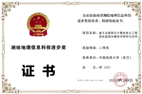 (通讯员:孙琨)2021年度海南省测绘地理信息学会年会于12月9日至10日在海口召开,由海南水文地质工程地质勘察院和我校等单位联合完成的科技成果《基于互联网云计算的岩土工程变形监测关键技术研究与应用》获得海南省首届测绘地理信息科技进步奖二等奖,世界杯官网李显巨副教授排名第三。